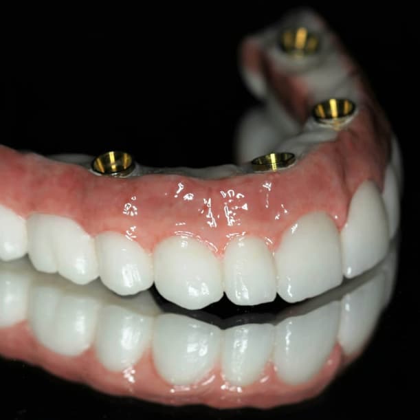After 3–6 months of healing, a custom-designed permanent zirconia or ceramic bridge is fitted.